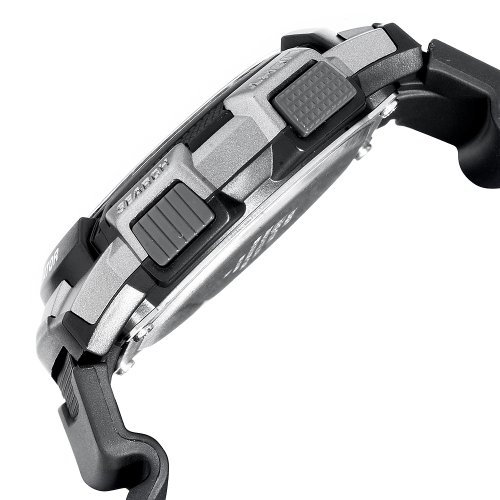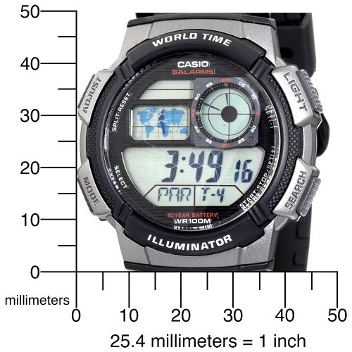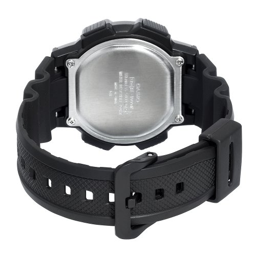 Cutting-edge technology combines with modern design in the Men"s Digital Sport Watch from reliable manufacturer, Casio. Encircled with large push buttons for easy operation, the durable, black resin case backgrounds a bold, black dial that features a world map time zone display, an analog sub-dial with Arabic numbers every five minutes, and a bright, digital display with day, date, and month information. The strong, black resin band is accented with textured details on the links and fastens with an adjustable buckle for the perfect fit. With a stopwatch, timer, five alarms, 10-year battery, and a water resistant depth of 330 feet (100 meters), this high-performance timepiece will accompany you for years to come.